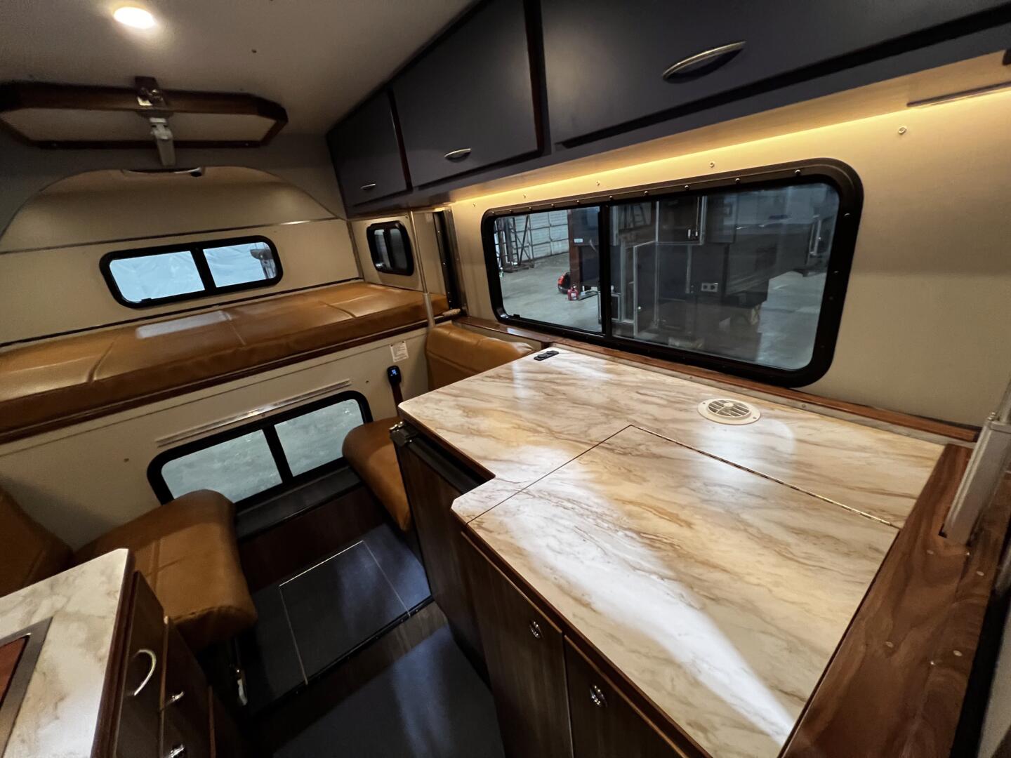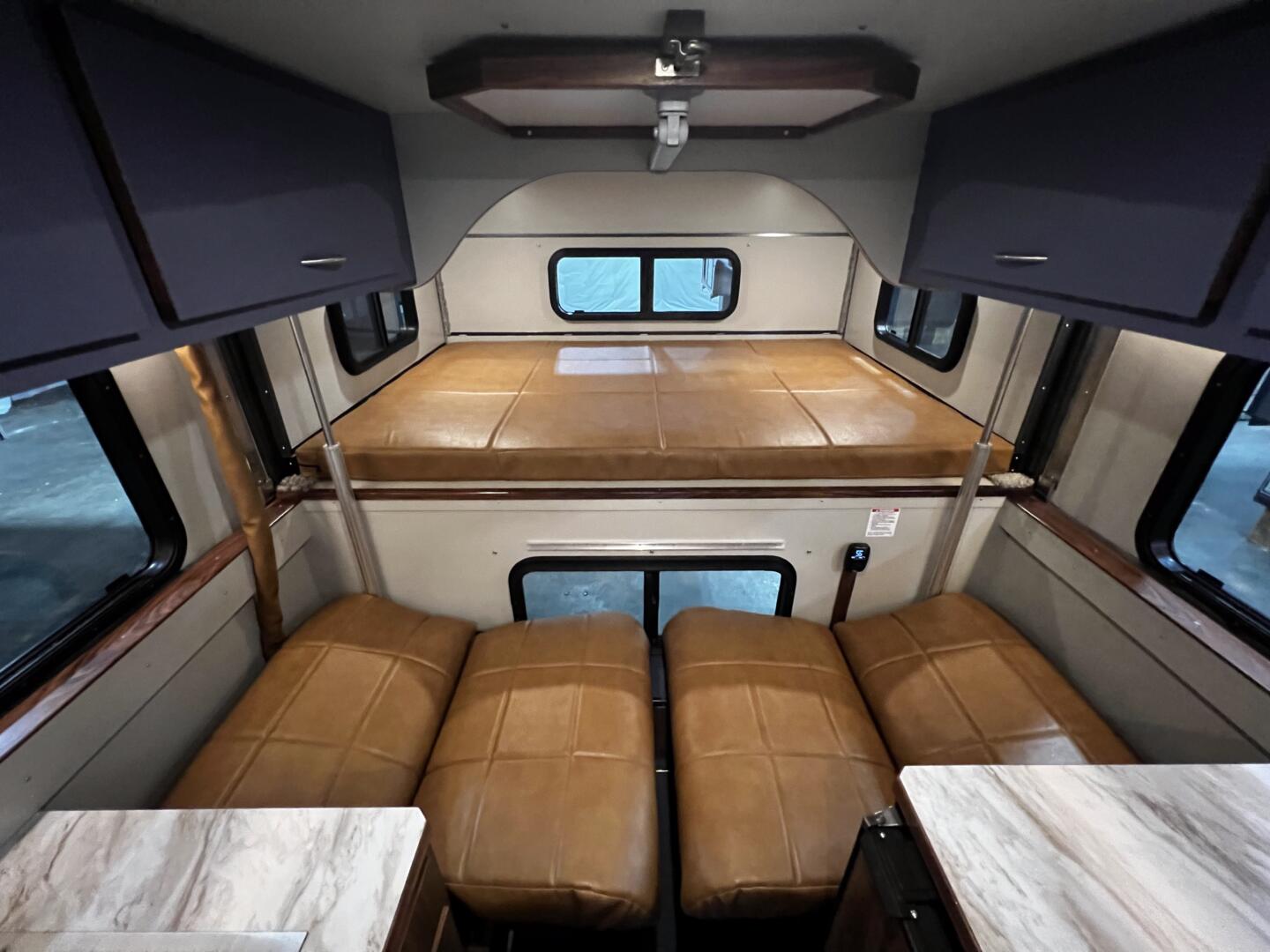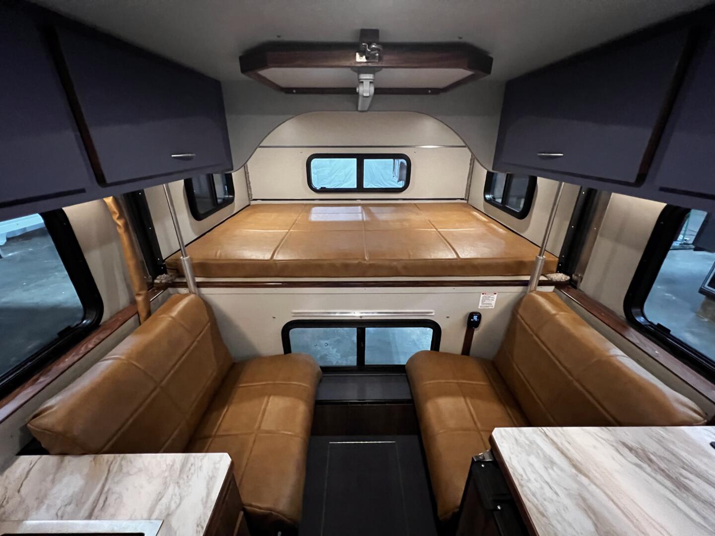 Step into the Arctic interior from Alaskan Campers, where warmth meets adventure in style. Deep blue upper cabinets pop against rich wood lowers, creating a cozy yet open feel. Sleek marble-textured countertops add a touch of elegance without clutter. Bright tweed-look laminate walls ties it all together with a subtle shimmer. The blue-and-white bounce light around, making tight spaces feel endless. Every corner invites you to kick back after a long day outside—like home, but better. Designed for comfort, this 650 SI fits everyone from solo travelers to families. Pops of color keep things lively without overdoing it. Arctic: your cabin in the wild, ready to roll.