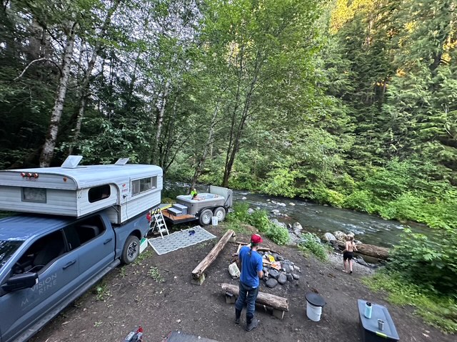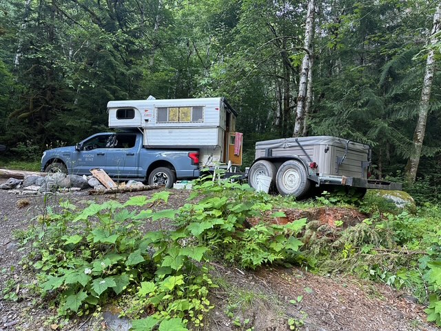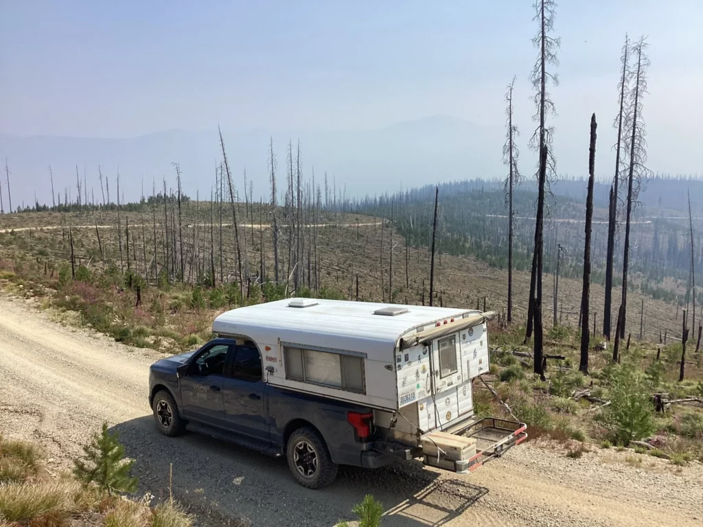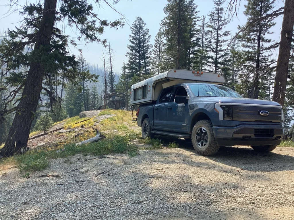 Matt ran it in a standard-range Lightning on KO3s, hauling the fully loaded 8-foot Alaskan with passengers, dogs, water, and gear. After charging overnight near Elk City, he climbed into the corridor, dropped into the Selway River valley to camp, then climbed back out through wildfire smoke and over Nez Perce Pass. He rolled into Hamilton with about 10 percent battery remaining, averaging 1.5 mi/kWh across the hardest terrain of the entire build. People deep in the backcountry couldn’t believe a Lightning made it that far from pavement.