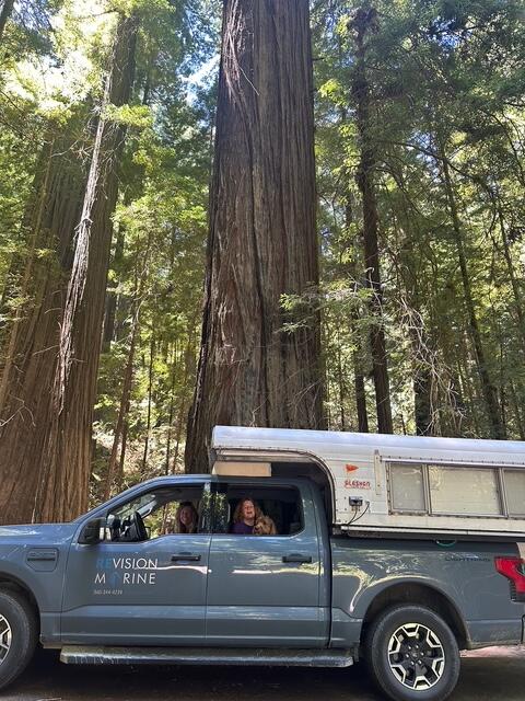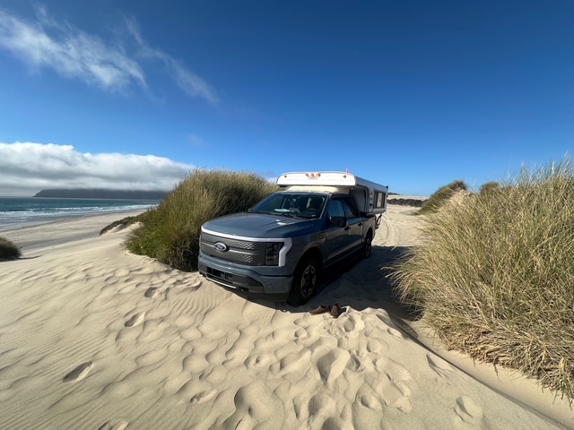 The first major test was a 3,125-mile loop from Port Townsend to Big Sur and back. Speeds on Highway 101 and Highway 1 rarely top 55 mph, which helps range, but hauling a 1,560-pound cabover still punishes efficiency. Matt, his family, and their dogs dry-camped for two to three nights at a time, then plugged into 30–50 amp RV service for a night to refill the truck and run cabin loads.