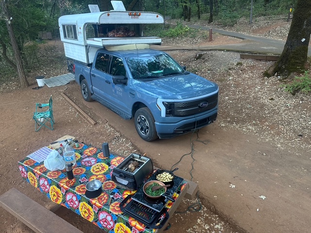 The setup pushes 2.5–3.0 kW of solar into a 7.2 kWh battery—enough on the right day to give the Lightning about 25 miles of range without relying on shore power or any backup. Just a fifty-year-old hard-sided pop-up quietly feeding the truck that’s hauling it.