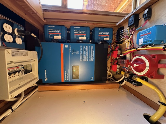 What makes the setup unusual is how seamlessly the old design absorbs the new technology. Vintage doors hide modern appliances. The cabin stays warm through a heat pump instead of propane. And everything—from induction cooking to lights to refrigeration—runs cleanly off the system Matt designed.