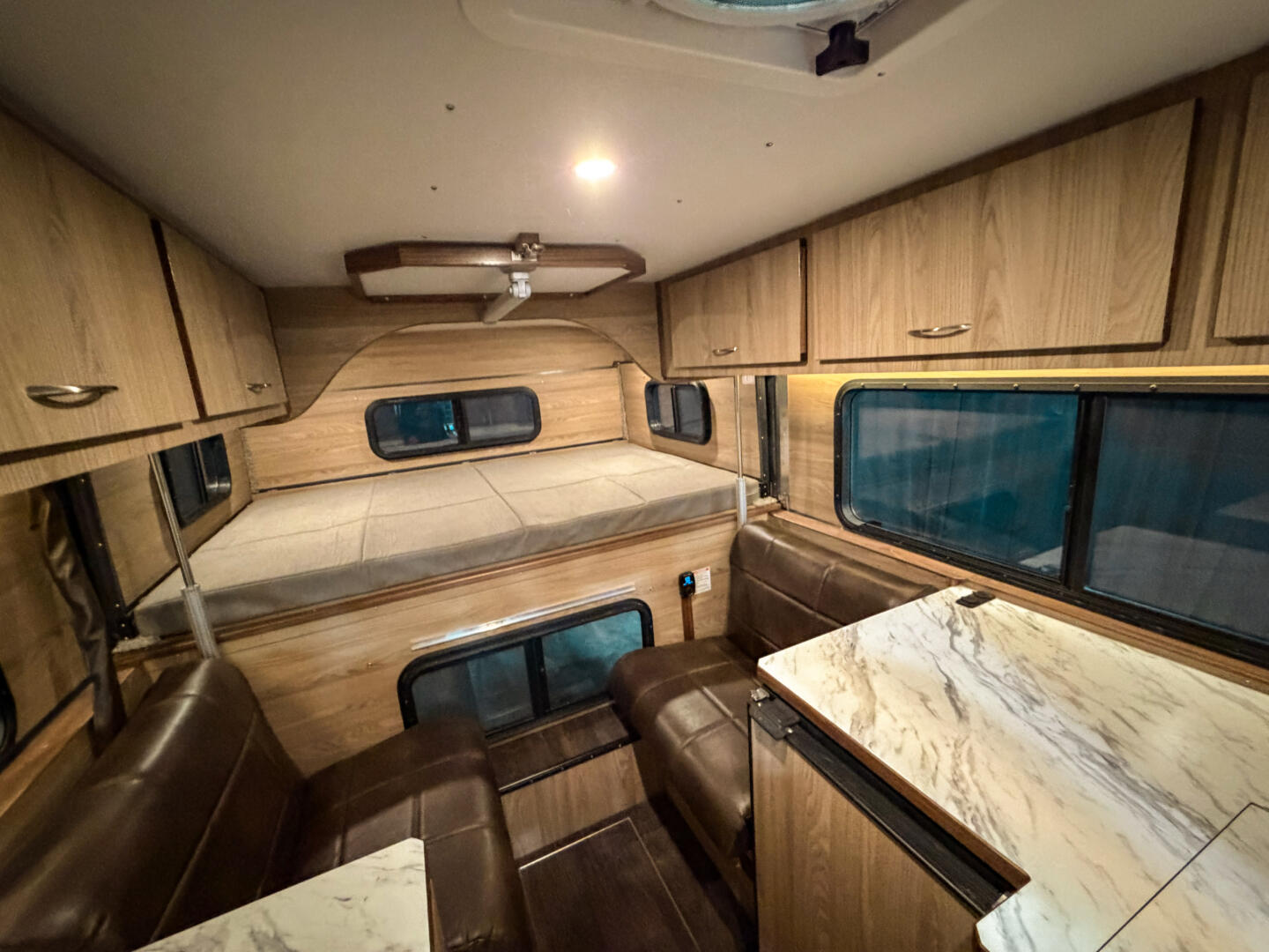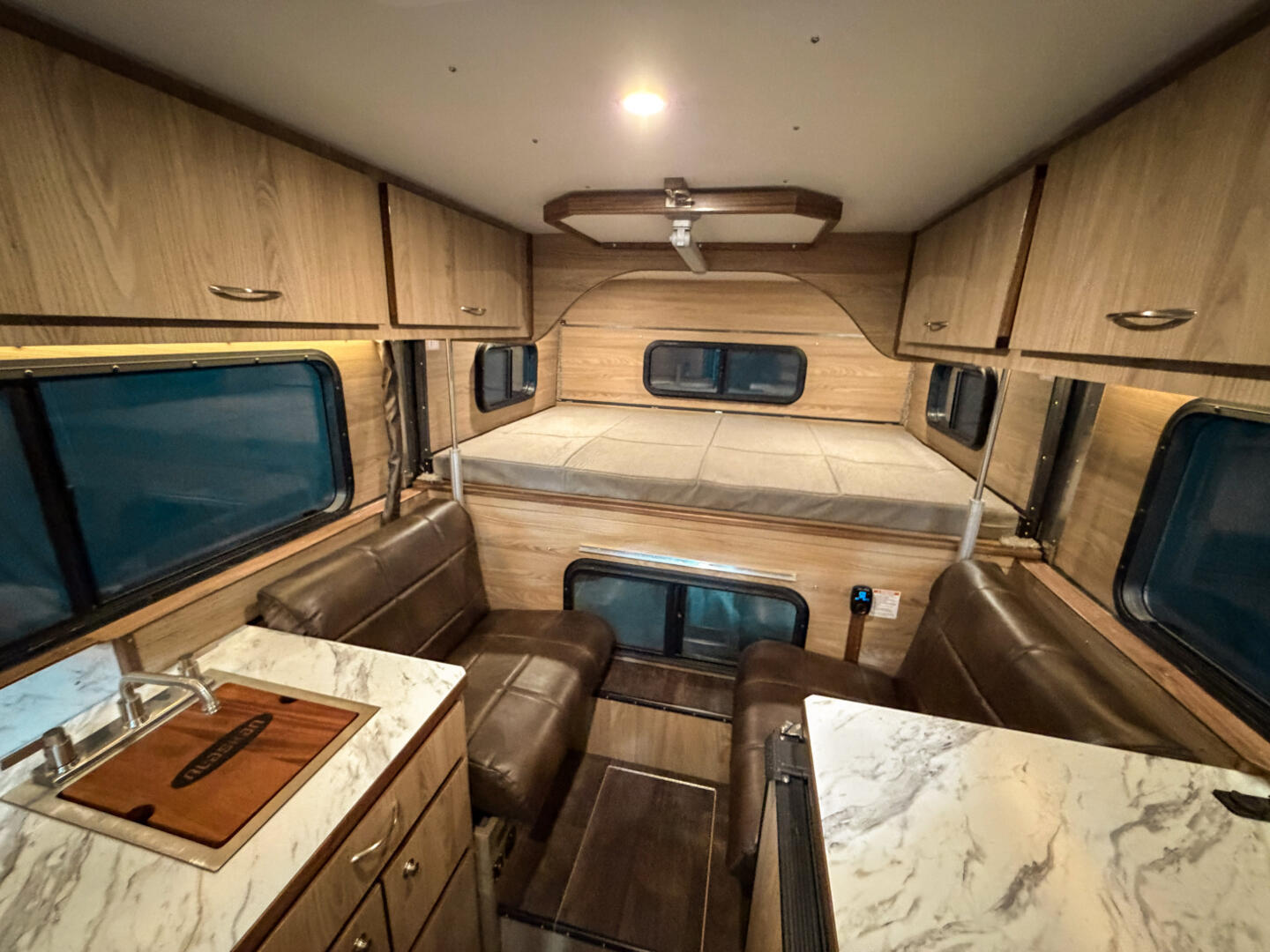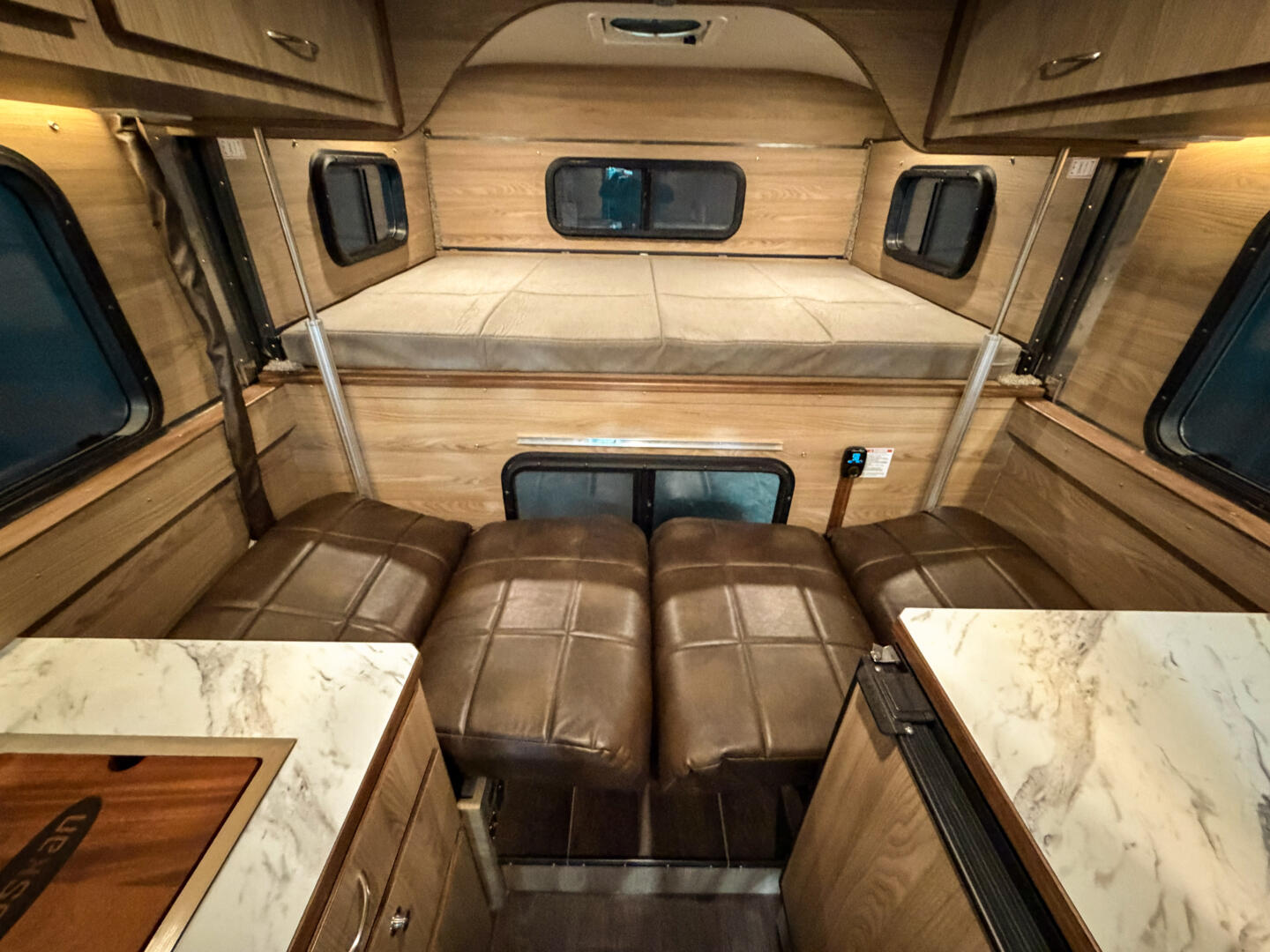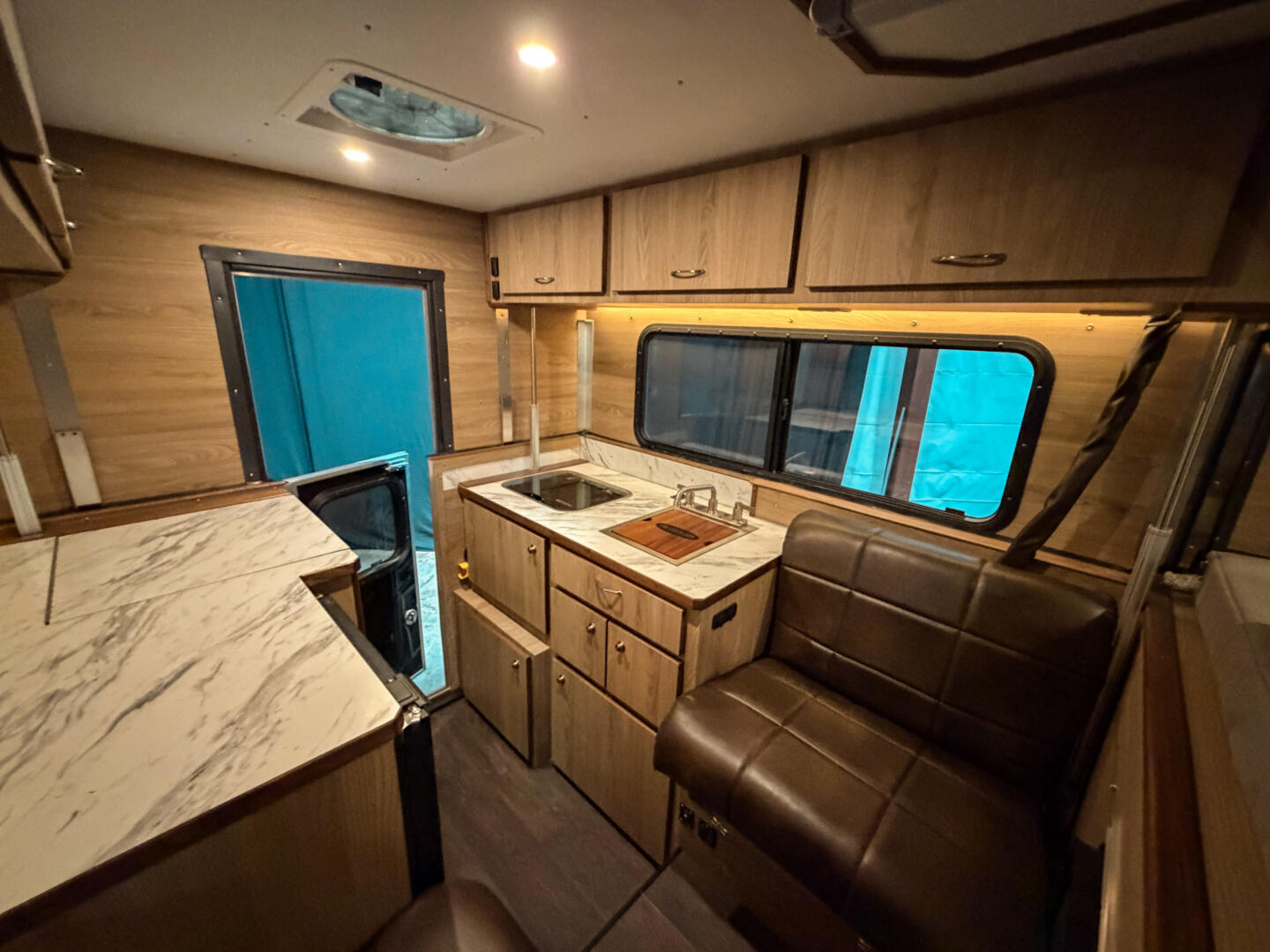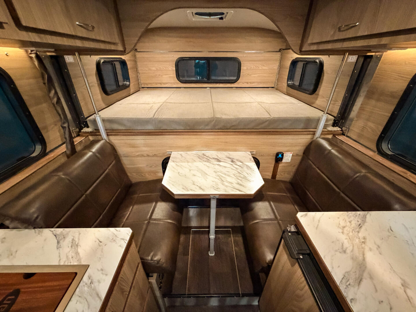 Our 650 SI is thoughtfully equipped so you can hit the road without a wait list! You get a powerful house system with two 162Ah battery, roof-mounted solar, DC-to-DC charging, USB ports for quick device top-offs, and a 4-gallon hot water heater for comfortable showers after long days outside. Inside, the 650 SI packs in a practical galley, 3.5 cu/ft fridge, forced-air furnace, and a roomy dinette, all wrapped in Alaskan’s durable, hand-crafted cabinetry.
