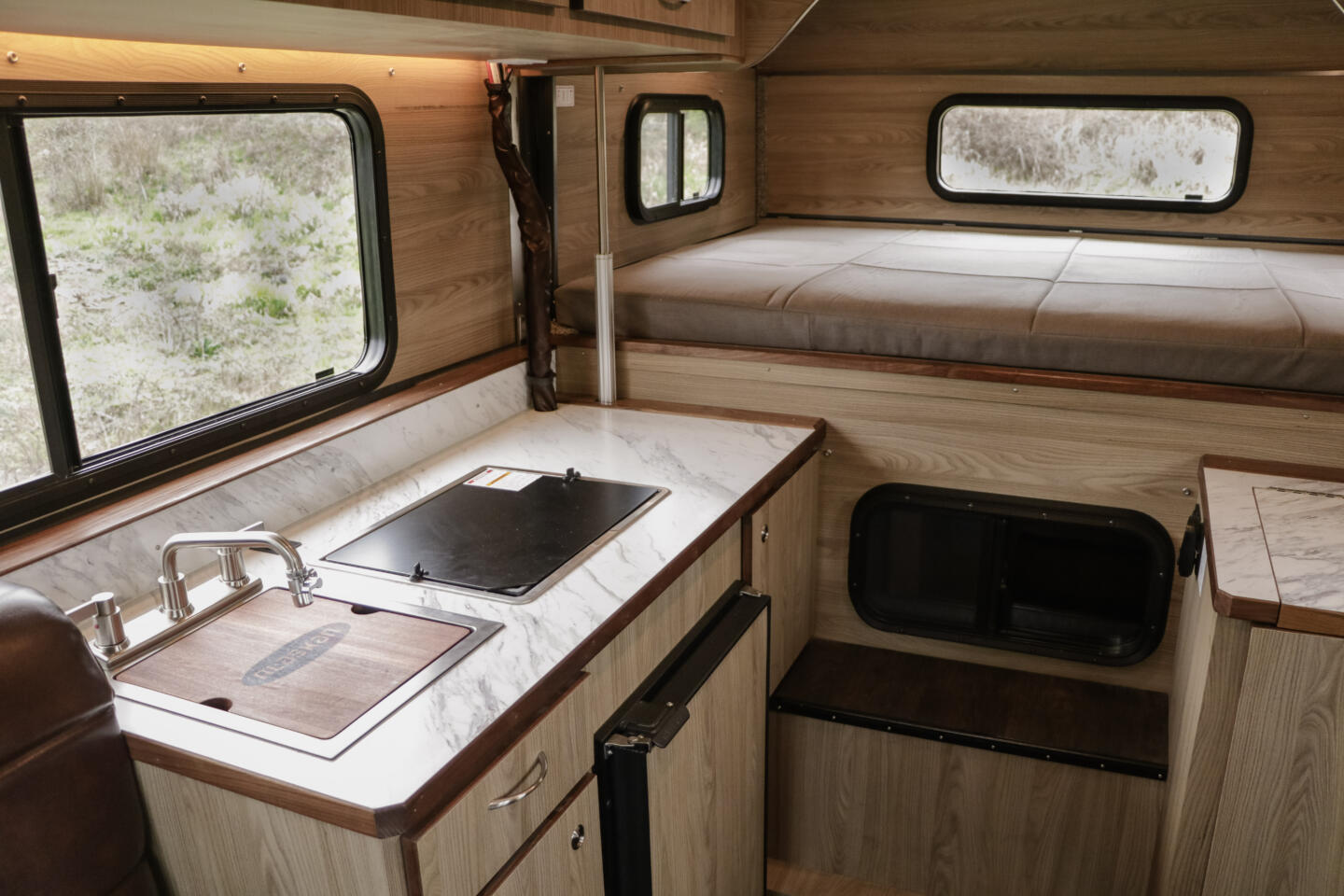 The 800 flatbed layout maximizes interior space with straight walls, generous storage, a real dinette, and a comfortable cabover bed in a footprint built for three-quarter and one-ton trucks. You get the features that matter for off-grid travel: a 12V fridge, efficient galley, heat, power, and water – without the bulk of a giant RV.