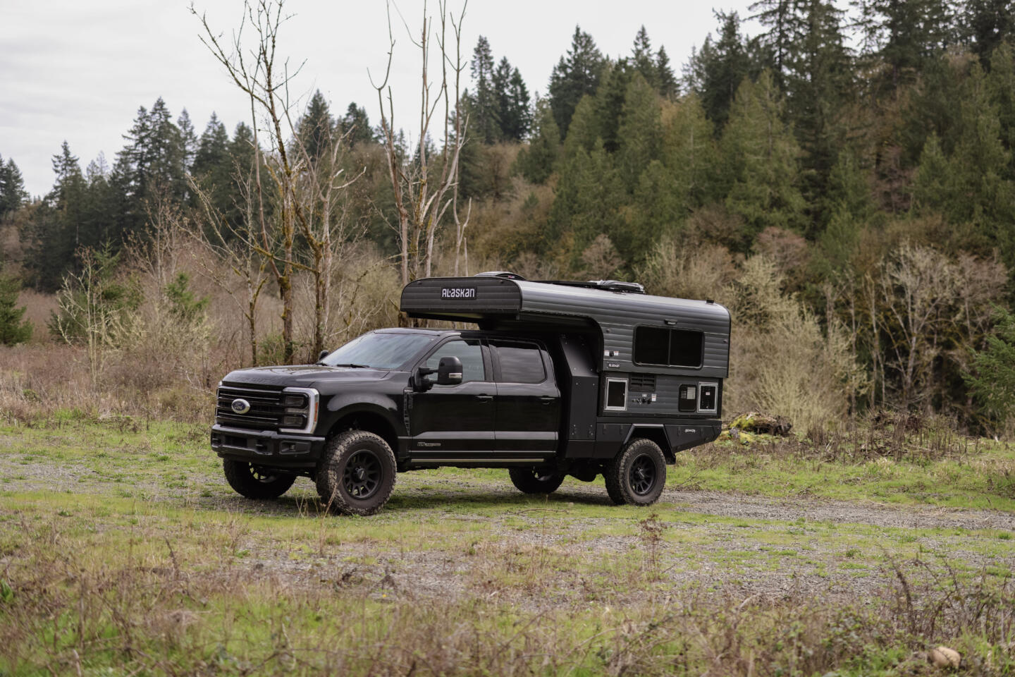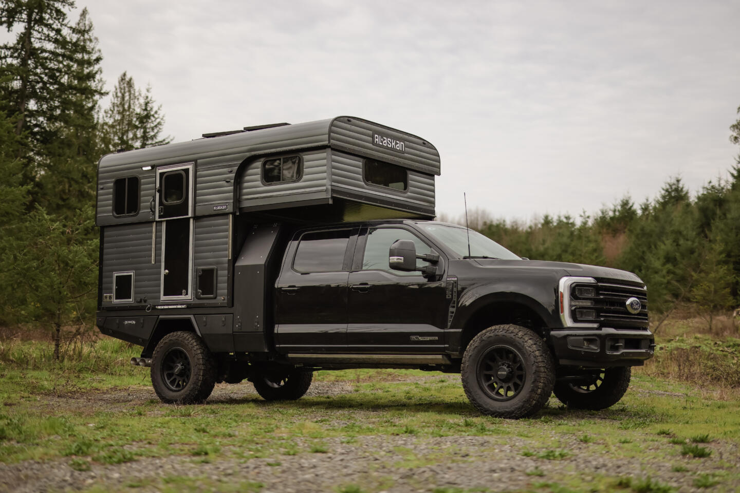 This build pairs an 800 FB Alaskan hard-sided pop-up camper with a custom Bowen flatbed on a Ford F-350, sold together as a complete, dialed-in adventure rig. The Alaskan’s telescoping, hard-sided design rides low and stable on the highway, then lifts into a solid, insulated cabin at camp for true four-season comfort.