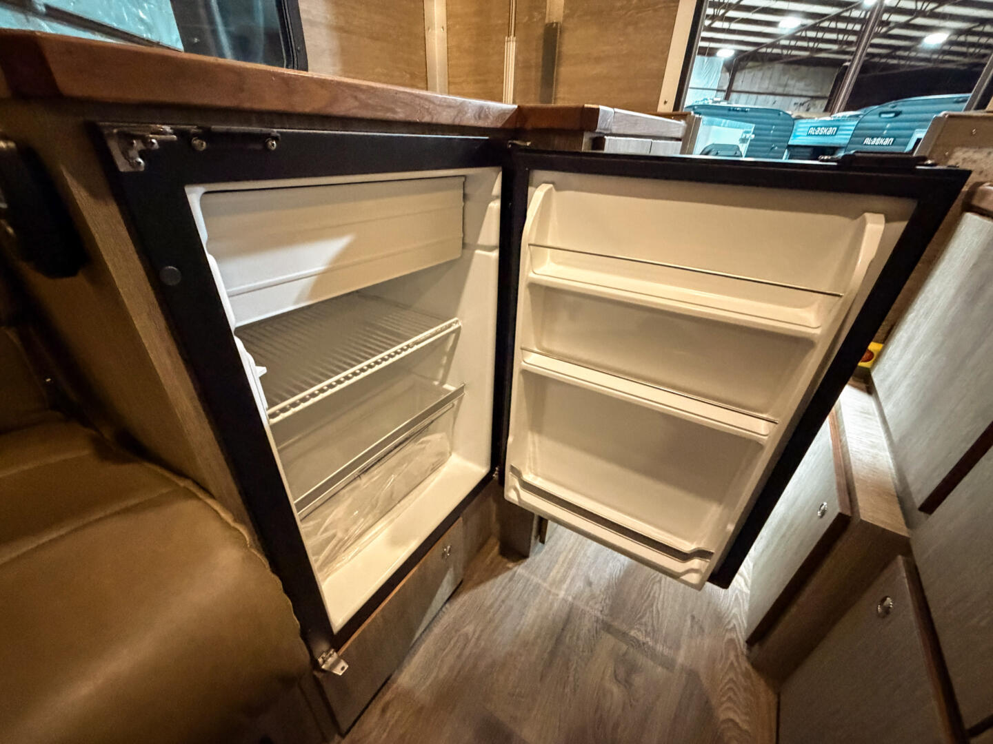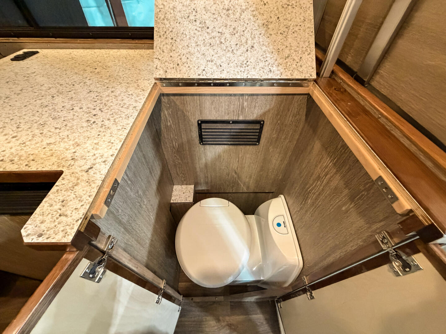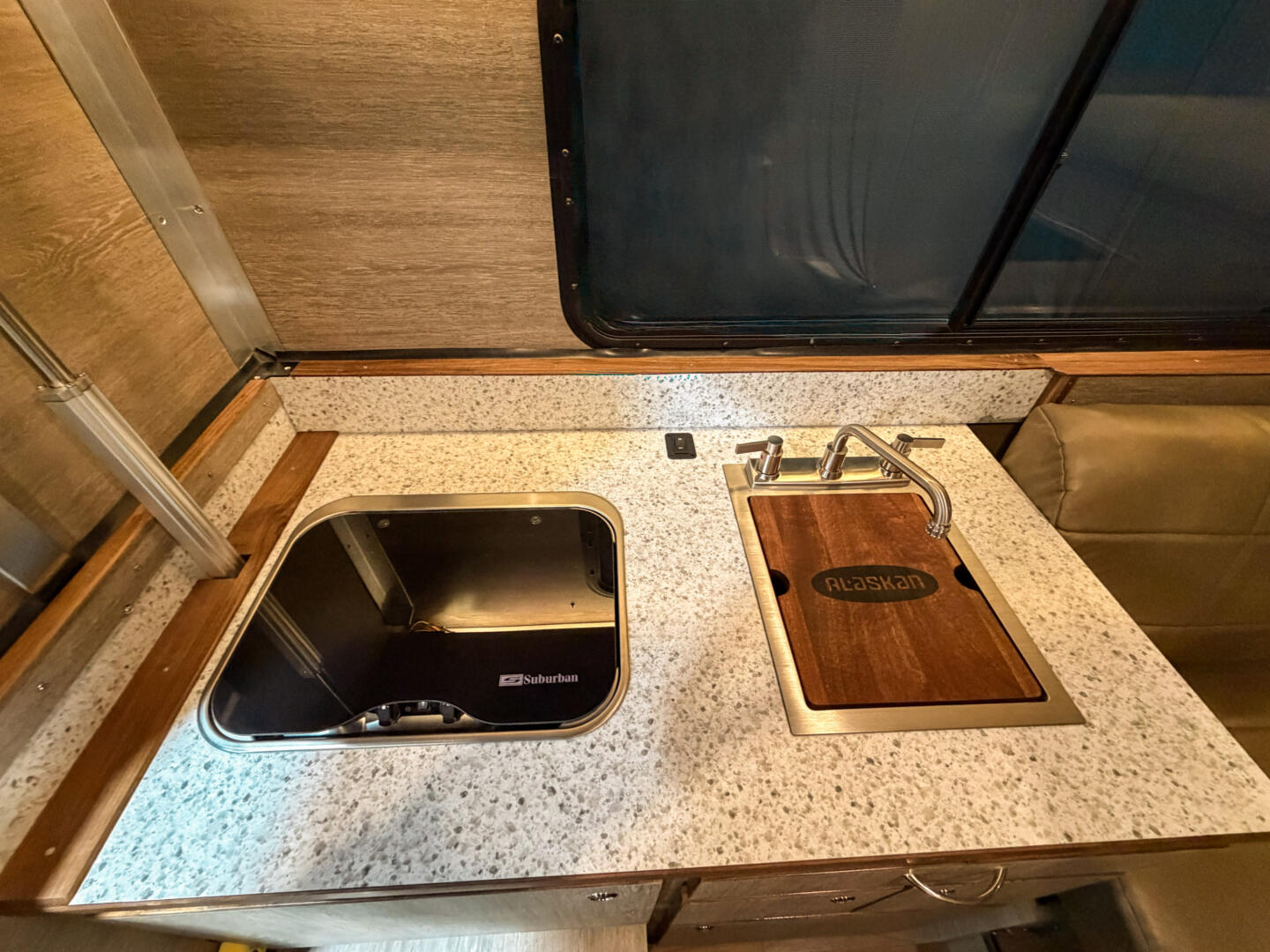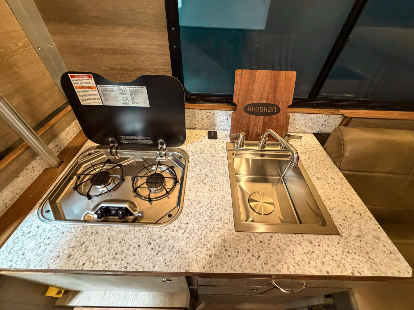 The galley is compact but highly functional. You get a 3.5 cu/ft NovaKool refrigerator, a cooktop, sink, and thoughtful storage wrapped in Alaskan’s hand-built cabinetry, giving you space for extended weekends or multi-week loops without feeling crowded. A cassette toilet is built in for added convenience when you’re far from facilities, and the camper’s insulated, hard-sided walls make early mornings and late nights more comfortable in real-world conditions.